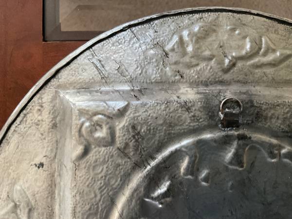 These antique Persian serving trays and/or wall plaques (each plate has a hanging ring on the back) is a unique addition to any collection. The round shape and metallic finish of the trays make them sturdy and functional pieces, perfect for serving drinks or displaying your favorite snacks. The trays feature intricate images of town meetings. The smaller plate is 12 inches in diameter and the larger one is 15-3/4 inches in diameter. Crafted from high-quality metal (they are fairly heavy), these trays were made to last and are sure to become cherished pieces in your home. Please note: the CASH sale/transaction WILL ONLY OCCUR IN THE LOBBY OF THE LOS ANGELES SHERIFF STATION LOBBY IN LANCASTER, CALIFORNIA!!!!! Period!!