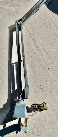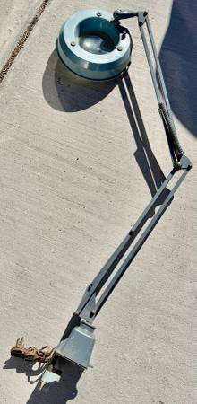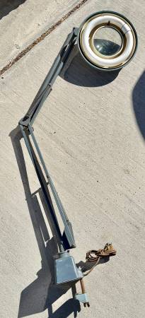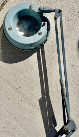 Here we have a fantastic magnifying glass and light. It has an articulating arm and moves smoothly, needs a good cleaning and oiling, otherwise it’s in great shape. Light button is a little finicky but does work and halo bulb still works too.