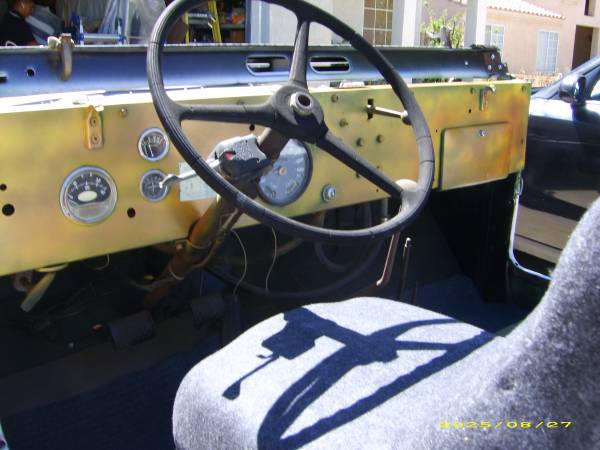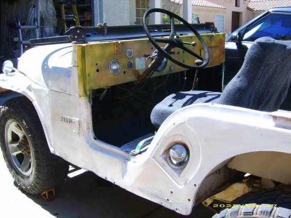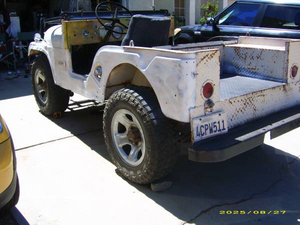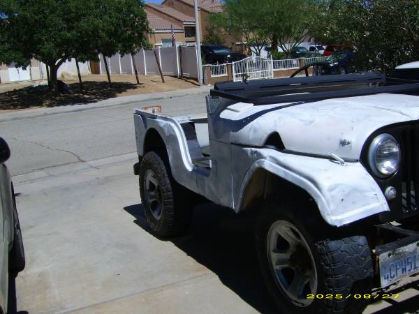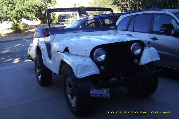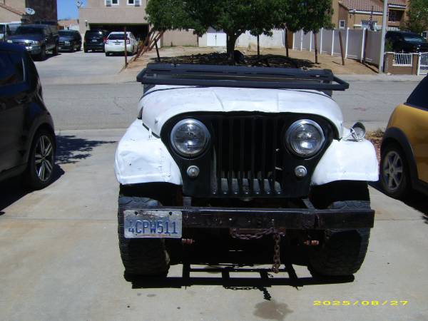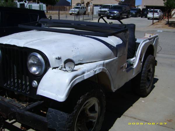 classic 1959 jeep CJ5 , there is 4x4 good transmission, 4 cylinders engine is running , it do not need smog, there is some dents around on hood , right and left fenders, on panels , good tires , seats ,need windshield . out of DMV, record, cause long time in storage, have a bill of sale . to get title when go registerer it, need some work , sale as is, $3800 or best offer, need towing , call or text show contact info