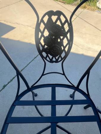 Has rose detail on the back rest. Will need chair cushions. May need some minor paint touch up.
