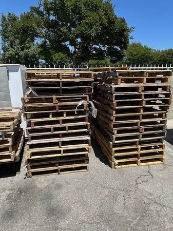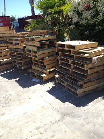 Wood pallets. most are 40 x 48 We have a variety of sizes at our Sylmar office too. how many always changes. Just stop in at Newhall Ice Building parking lot 22510 5th Street Newhall CA 91321