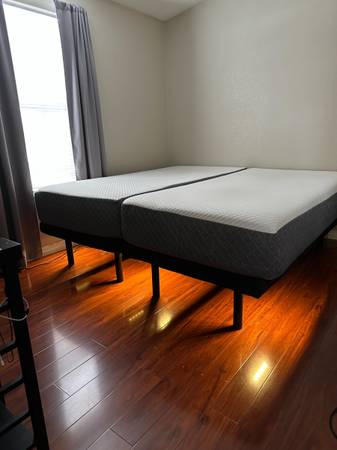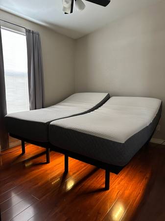 Adjustable Split King GhostBed (two Twin XL mattresses with two adjustable frames) in great used condition—firm 11” memory foam from a smoke-free home.