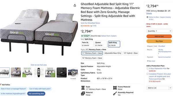 Split King Adjustable Set priced at $800.