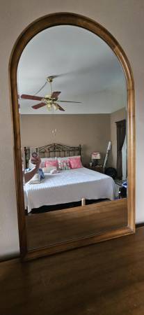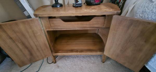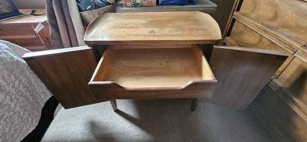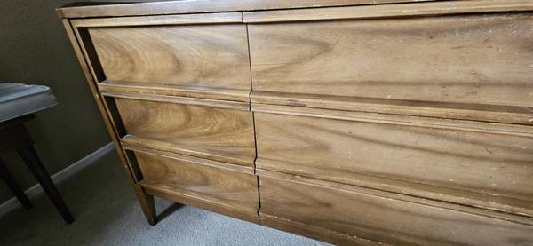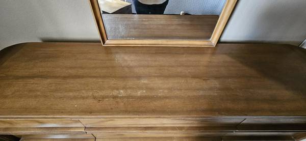 Looking to sell vintage solid wood dresser. Comes with large vanity mirror and 2 matching nightstands. In great condition, just needs a little paint touchup or staining. Moving and cannot take this...