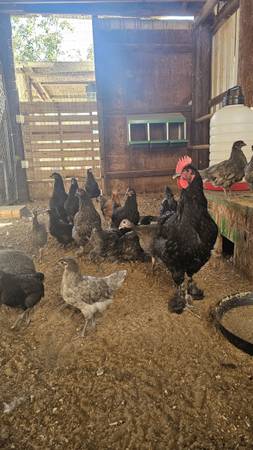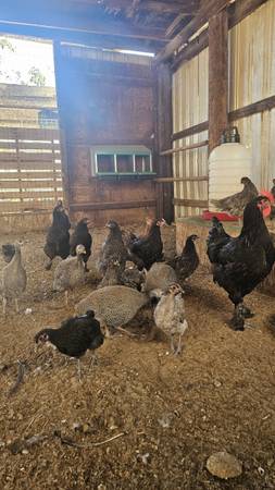 I have a total of 12 chickens and 1 rooster Black maran Blue maran and Cochin breeds All are about a year old will be ready to lay eggs next year *GUINEAFOWL ARE NOT FOR SALE *