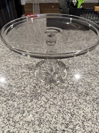 Glass pedestal cake plate stands 8 inches tall X 12 inches wide.