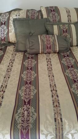 6 Piecees: Queen Comforter (86 in x 86 in), 2 Standard Pillow Shams (20 in x 26 in) and 3 decorative Pillows (12 in x 16 in, 16 in x 16 in and 7 in x 16 in).