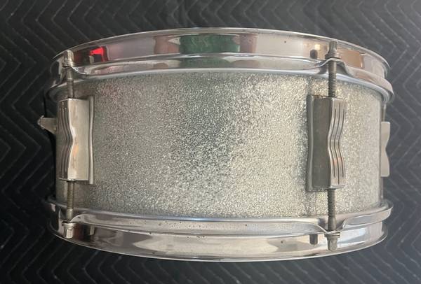 This is a 6 lug all original 5 1/2" x 14 Ludwig Pioneer snare drum. The serial number would date this between 64 and 65. Red felt baseball bat muffler, Nickle parts and original wrap. You can see in the photo that the wrap goes into the wood plies. This drum has 6 lugs but still sounds fine. I replaced this snare with two 8 lug snares for my kit.