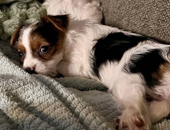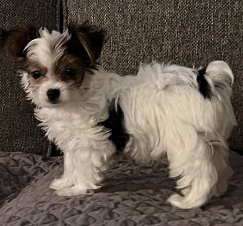 Two female parti yorkie puppies, 18 weeks old. First shots, tails docked, dewormed with a five year health guarantee against congenital defects. One will be 3.5 lbs full grown and the other will be 5.5 lbs full grown. Call or text me for fee information. show contact info