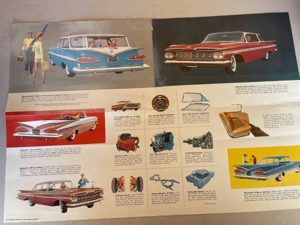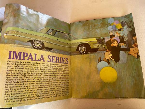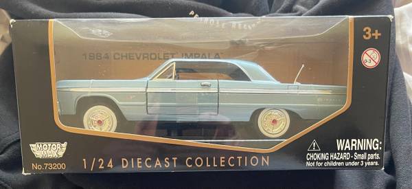 I have a diecast 1959 El Camino hot rod $40, 59 Chevy impala color brochure $5.. 1964 Chevy impala 1/24 die cast metal car brand new never opened $45 64 Chevy Impala service manual $40 .. 64 Impala owners guide $10 64 Impala full color sales advertising brochure $10 California whale tail RIDY OH! Felix the cat License Plates $400