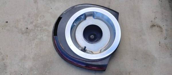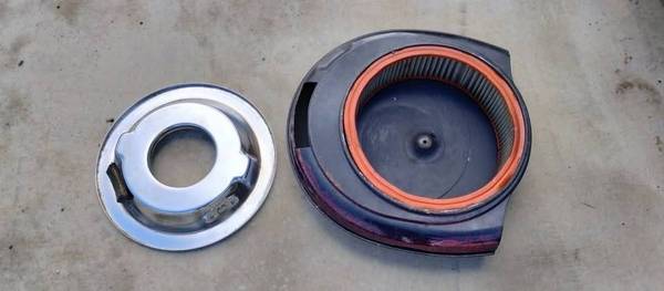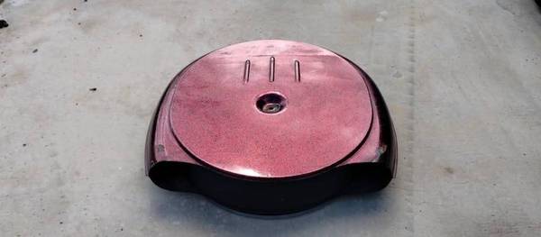 Not sure if this Bat Wing style air cleaner is an original or a reproduction. It is pretty heavy, painted a metal flake dark red and comes with the aftermarket recessed base and Fram filter pictured. Cash only.