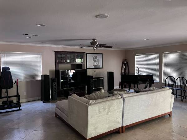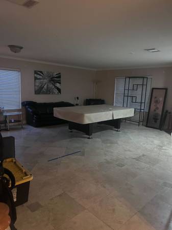 All of the common areas are downstairs which includes the living room, pool table, spacious kitchen with refrigerator, stove and microwave and access to the patio in the backyard. The living room is fully furnished