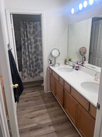 A clean, freshly painted bedroom with a walk-in closet available to enjoy. Located in the beautiful and quiet neighborhood of Castaic, CA. It is a shared bathroom that includes a double sink and a separate bathtub/toilet room. The room has newly installed vinyl wood flooring and is freshly painted white. The washing and dryer machines are upstairs for easy full access and usage. Hardly used twin mattress available and included.