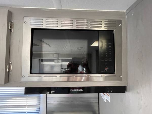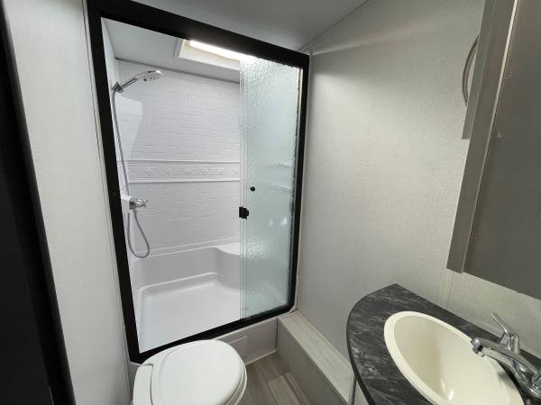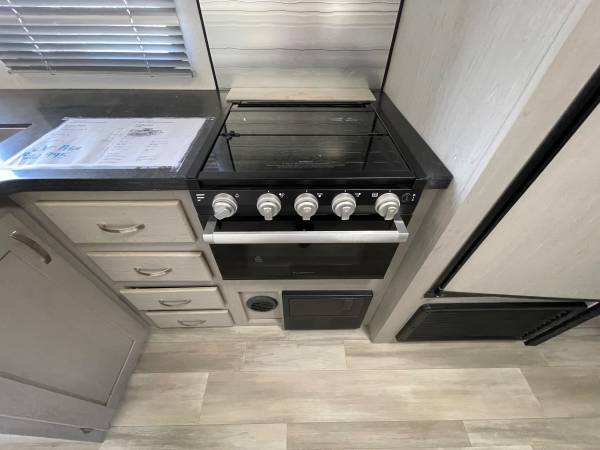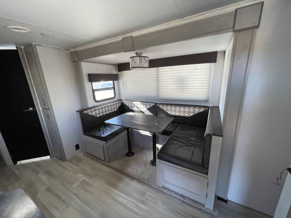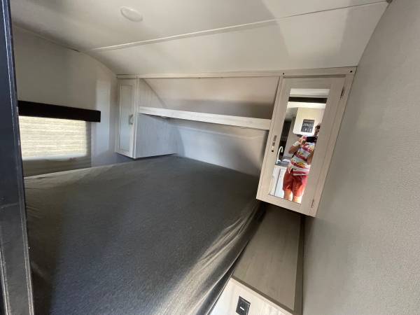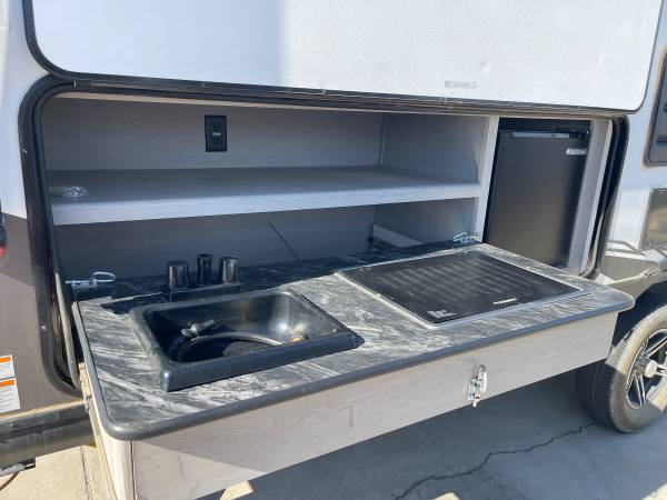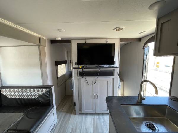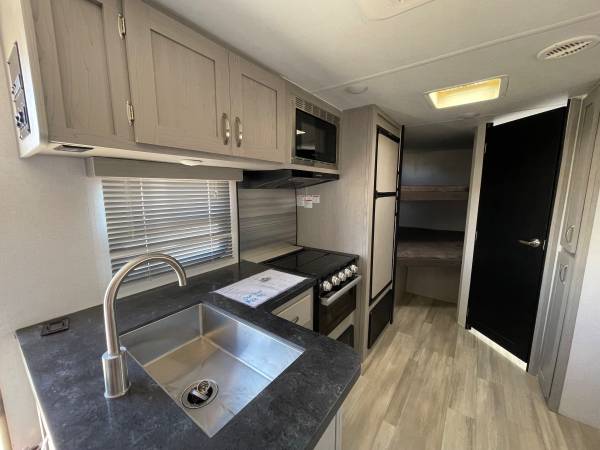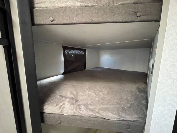 Lightweight, easy to tow, and ready for adventure! Sleeps up to 8 with queen bed, double bunks, and a big slide-out for extra room. Modern kitchen, full bathroom, and outdoor kitchen with mini fridge + grill.