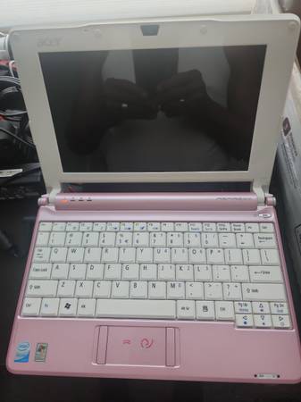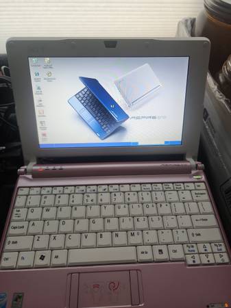 Acer Aspire One ZG5 Pink, 8.9" Screen, 1GB Ram, 160GB HD, Intel Atom Single Core, Built in Webcam, Multi-Touch Track Pad. Needs a replacement battery. Netbook cuts off when power cord is disconnected. While connected it stays on, with A/C cord, included. USB 2.0, Microphone Jack, D-Sub RJ-45, Headphone Jack, SD expansion slot, 8GB HD. Has a carrying case with A/C cord storage slot. Windows XP installed. Has McAfee Security Software. Has a Ethernet Cord connection port for a wired connection. Has Network Adapter for Wireless Connectivity. You can upgrade Windows XP to a newer version using a USB flash drive or using a wireless connection online with {url removed}. This netbook came out around 2009, which explains why its pre-installed with Windows XP. MAKE ME an OFFER.