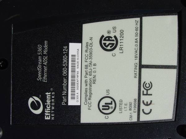 EFFICIENT NETWORKS SPEEDSTREAM 5360 Ethernet DSL Modem 060-5360-124. The SpeedStream 5360 DSL Modem works with any Ethernet equipped PC, regardless of operating system. Comes with power supply. Sold...