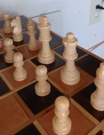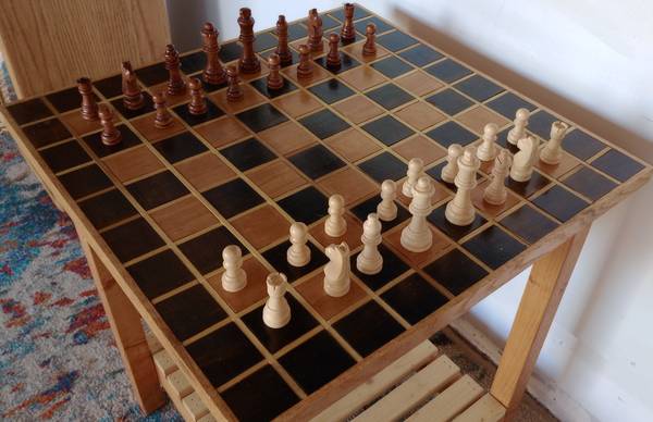 Nice Chess Table and wooden chess set. Ready to play. Compact and well made custom board. Price lowered!