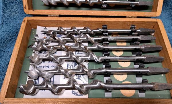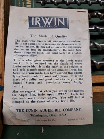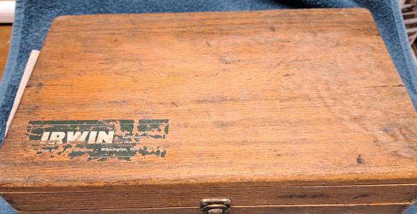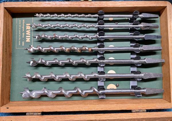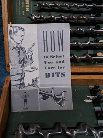 Vintage Irwin auger drill bit set 13pc in dovetail case, 1957. $75.00 OBO Pre-owned in good condition, if interested call or text 661 four zero six-2466