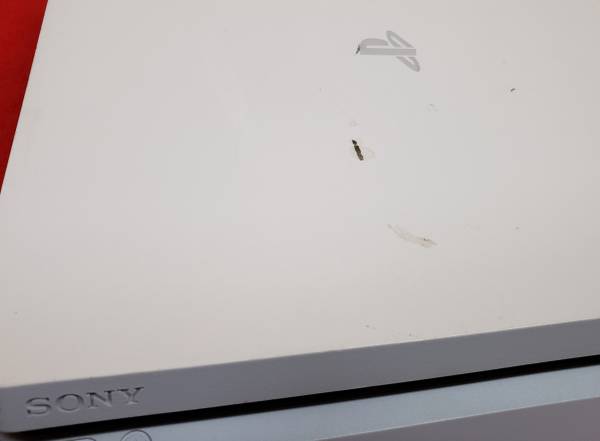 **Console has heavy signs of wear from regular use. Wear on console includes heavy scuffs, scratches, and stains on top cover. Top cover also has a crack on back corner. Console is missing hard drive cover. Console also has noticeable scuffs and scratches around ports and on gloss trim. Controller and cables have normal wear. Disc tray functions properly but inserts/ejects disc really slow. Please refer to pictures for item's overall condition.**