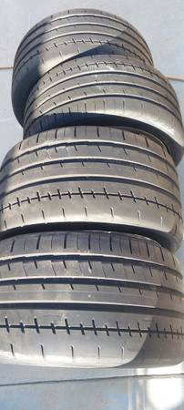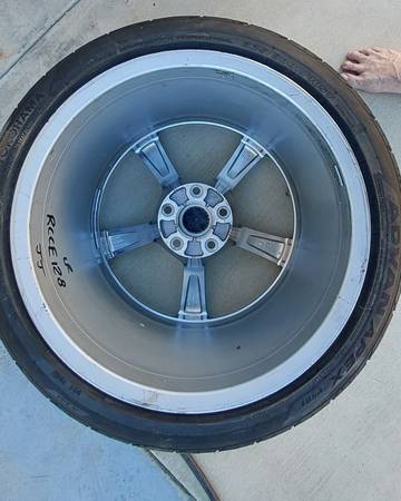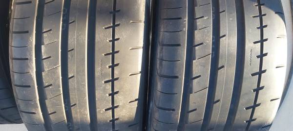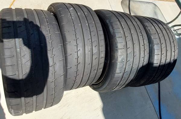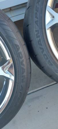 The four tires are Yokohama Advan Apex, front 275/35R18, rear 325/30R19. All four tires have less than 1,100 miles on them. If you look at the pictures of the tire tread, you can still see the word "ADVAN" molded into the rubber. Hardly any wear! They have been mounted and balanced with four new TPMS sensors and are ready to roll!!