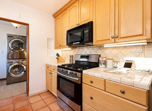 The chef’s kitchen comes fully equipped with immaculate, modern appliances including a gas range, microwave, dishwasher, and refrigerator. Additional conveniences include central air and heat, a private laundry room with washer and dryer, ample storage, and freshly painted interiors and exterior.