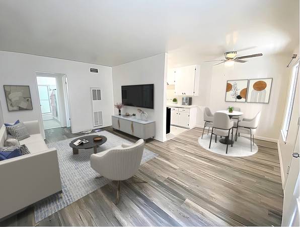 The spacious 1BR has an open floor plan and lots of light from several windows throughout the unit. Living room with separate dining area, kitchen with modern appliances and plenty of cabinet and counter space.