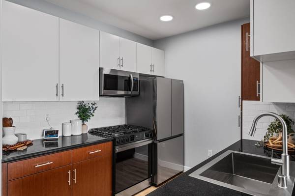 The contemporary cabinetry features brushed nickel hardware and granite countertops
