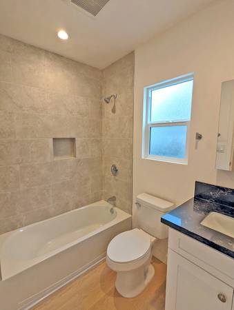 Gorgeous Remodeled 1 Bed and 1 Bath Apartment with Lots Of Natural Light! The Living Room has Wall A/C Unit, Recessed Lighting and Hardwood Laminate Flooring Throughout. Kitchen with White Cabinetry, Dark Quartz Countertops, Stainless Steel Single Basin Sink with Modern Faucet, Tiled Backsplash and Stainless Steel Appliances: Refrigerator, Gas Stove, Dishwasher and Microwave. Washer and Dryer in the Unit. Gorgeous Bathroom with a Bathtub with Beige Marble Tiled Backsplash and White Vanity Cabinet with the Dark Quartz Countertop. Bedroom with Large Closet. This unit is in the West Adams Area near Trendy Coffee Shops, Restaurants, Stores and Parks like Leslie N Shaw Park and Vineyard Recreational Center. Tenant Pays All Utilities - Including Prorated Share of Water and Trash (Rubs). Street Parking