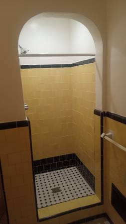 The bath offers the original Art Deco sunny yellow and black tile motif with a separate bathtub and stand up shower.