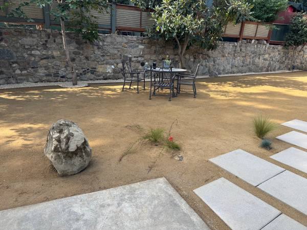 Minimalist soft and hardscape, with matured fruit trees, also included outdoor table and 4 seating.
