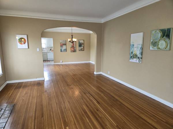 Spanish style quadruplex located in Miracle Mile/Hancock Park adj. Lower unit w/approx. 1,500 sq. ft. Spacious living room w/barrel coved ceiling and Batchelder fireplace. Formal dining room. Eat-in cook's kitchen w/tile countertops and stainless steel appliances. Indoor laundry w/washer and dryer. Gleaming hardwood floors in living room/dining area; and carpet in both bedrooms. Designer ceiling fans in bedrooms. Closet space galore. Freshly painted. Light, bright and airy. Great curb appeal. Quaint outdoor patio. Onsite parking for one car. Centrally located to downtown and the Westside. No smoking. Prescreening required.