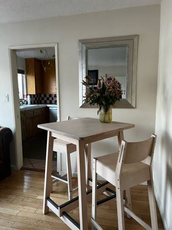 One parking spot is included in the garage below. FURNISHINGS IN THE LIVING ROOM INCLUDE: Chesterfield couch set, 50inch TV, Hue light system, breakfast table, glass coffee table, wall heater, A/C unit, Large second closet, Vinyl Player, Contemporary artwork