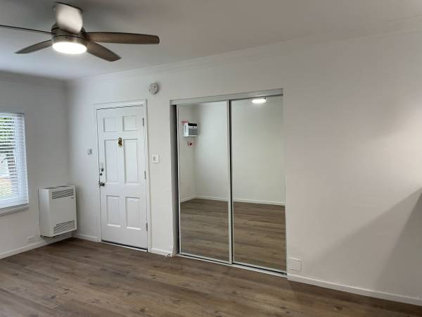 This beautifully updated studio features a spacious living area with wood-style flooring, fresh paint throughout, mirrored closet doors, a wall A/C unit, wall gas heater, and a new double-pane window.