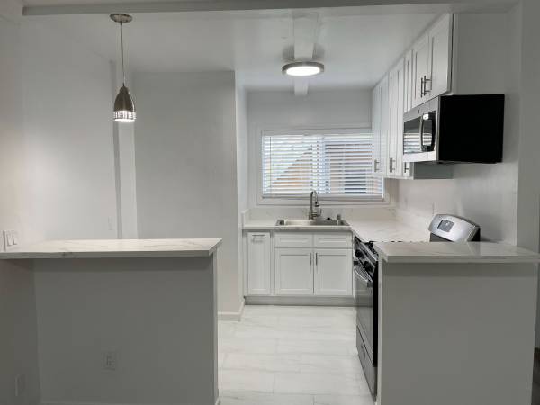 The modern kitchen offers quartz countertops, stainless steel appliances including a dishwasher, gas stove/oven, and over-the-range microwave, complemented by updated cabinetry and a stylish light fixture.