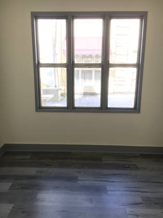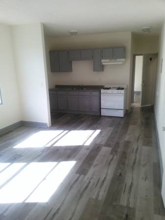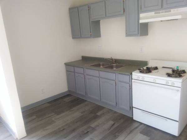 Brand new open kitchen with dining area and gas stove, tenant provides refrigerator.