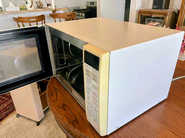 Just like new, save money the Sharp carousel countertop microwave oven is 15 inches tall. The top is from front to back 18 inches and wide 25 inches.