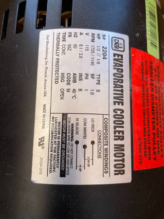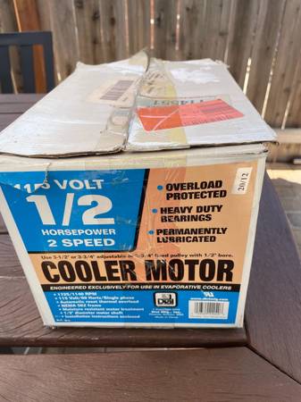 New Open Box Item - DIAL 115 Volts 1/2 HP 2 Speed Evaporative Cooler Motor Model: 2204 Asking: $80 Call: - 115 Volts / 60 Hertz Single Phase - 1725/1140 RPM - Automatic Reset Thermal Overload - NEMA...