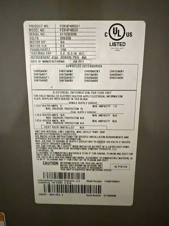 -Unit 4: International Comfort Products Fan Coil w/ 4 ton capacity (paired w/ 3 ton CU above). Model # FEM4P4800A; serial # A110383086 (manufactured in 2011)- $700