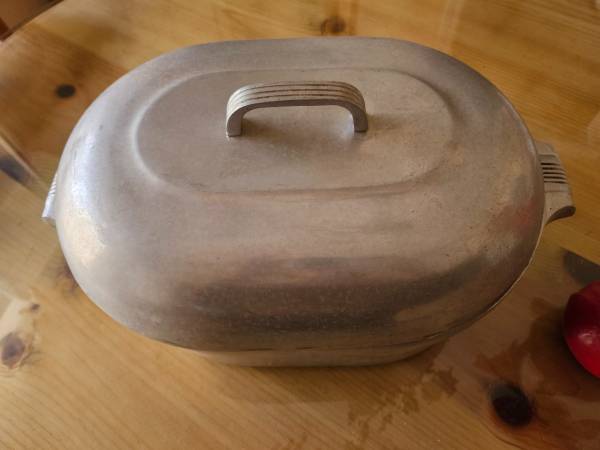 WAGNER WARE SIDNEY, roaster/Dutch oven. It is made of aluminum and measures 18" long, by 11 1/2" wide, by 5 1/2" tall, by 10 1/2" with lid on. It is made in the USA and is a 13 quart.