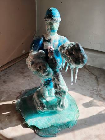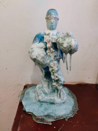 Frozen reptile soldier. 12 to 13 inch blue and green glossy sculpture. Has a realistic frozen look to it.