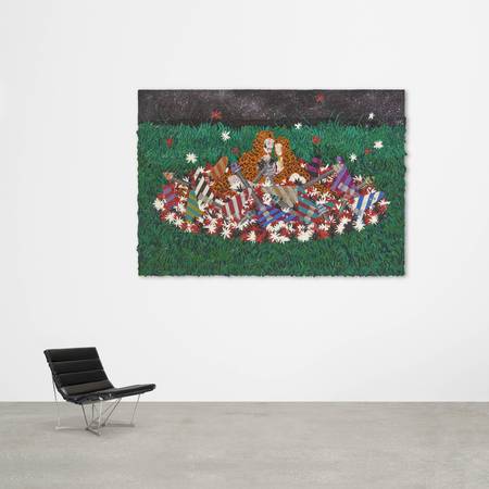 The painting is VERY large at 54 inches tall by 76.5 inches wide and heavy. It also has to be carefully stored/transported, as the acrylic "grass" extends below the panel. Prior to hanging, it can be stored either horizontally on its back or vertically upside down, with the top of the painting on the ground, which is how it has been stored to date.