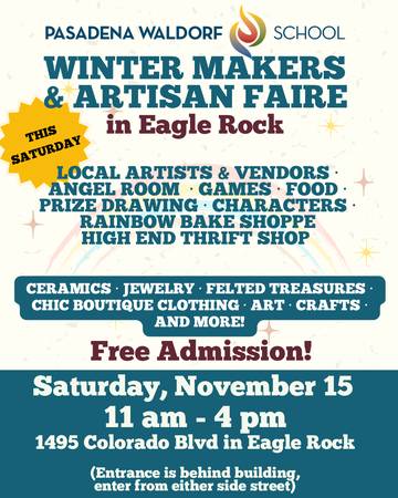 GET your Holiday Gifts Spiff Up your Fall/Winter Wardrobe & Support Arts Education at PasadenaWaldorf School's WINTER MAKERS' FAIRE! FREE ADMISSION Saturday, November 14 11 a.m. - 4 p.m. 1495...