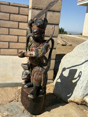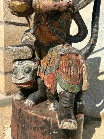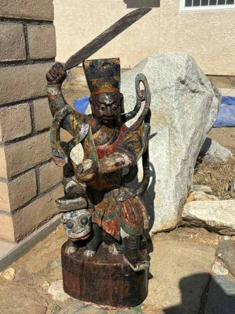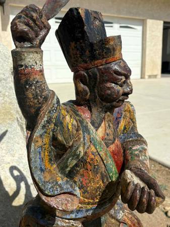 This wooden statue depicts a warrior wielding a sword and riding a mythical creature. Intricately carved, with vibrant color details Likely early 20th century, in excellent condition for its age...