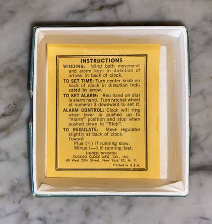 Mid Century folding travel alarm clock with original box and instructions. Wind up, in a brown case and white dial with gold numbers and gold metal trim.