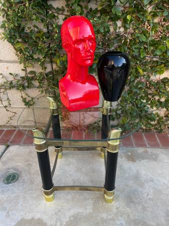 The tables feature a beveled glass top and a base with faux tusks made of brass and a black composite material. Some patina and surface scratches due to age and use.