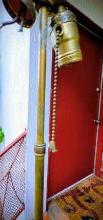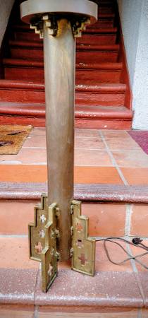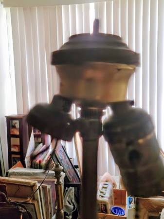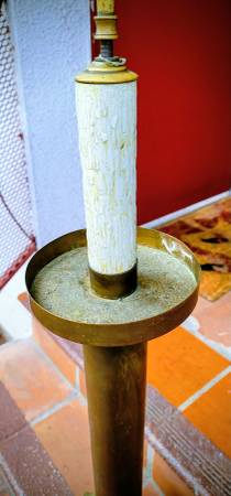 Basically excellent condition 50 inch floor lamp. Solid Brass Candlestick, heavy. Old Patina. This was rewired. IT had a sealer on it which discolors (1950) so I removed it. Solid brass. It was moved into storage because some work was being done. When I got it back, one of pull bulb holders was missing. 1 still hworks, other 2 wires to attach a bulb holder. Top has screw to attach a finial. I would have put this at $550-600, but have priced it down to cover the effort to fix it and find it a hone quuckly. Handy man or woman, DYI or local handyman/ woman can gix re easily. Many can do this themselves, or simple for any electrical store. I used to have a little shop I used, but they are gone as rents got too high.