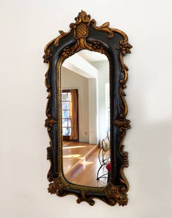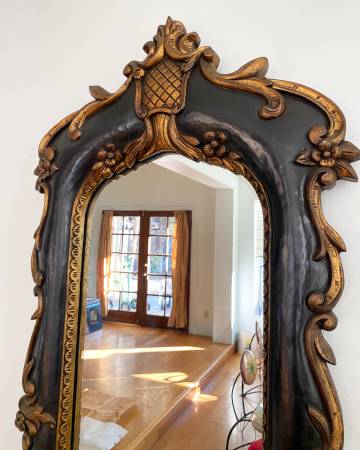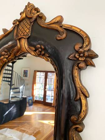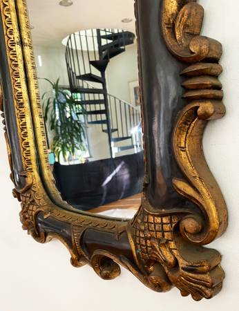Beautiful well preserved vintage Italian Venetian, Rococo style, Baroque wall mirror. Hand carved wood. Painted dark brown and gold. In pristine condition. Dated in the back 1970's. 48" x 21" tags:...
