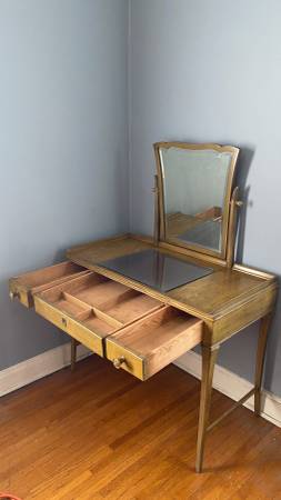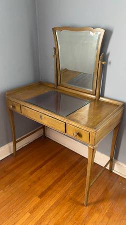 Beautiful vintage wooden vanity / dressing table with an elegant built-in mirror. Art Deco / Mid-Century Modern