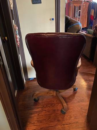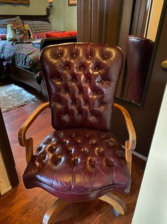 Late Georgian style fully upholstered swivel mounted executive desk chair. Upholstered in button tufted aubergine leather. Lovely classy chair for an executive. Was appraised at $1200 12 years ago.