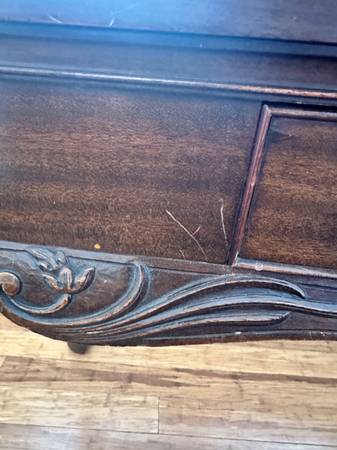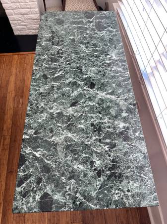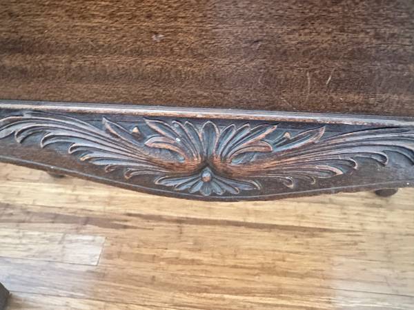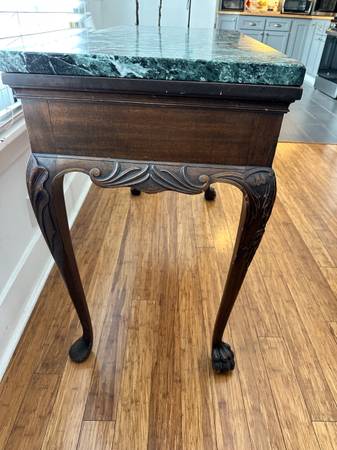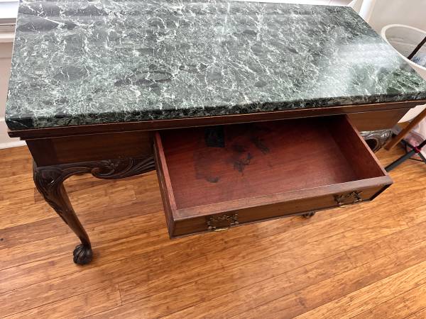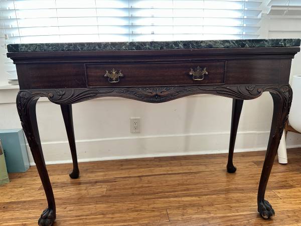 Beautifully well-crafted Chippendale Revival console/Side Table (made in the early 1900s - this was a reproduction of a 1700s Chippendale piece). Mahogany features with a stunning green genuine marble top, cabriole legs, carved claw feet, drawer with dovetail joinery and brass batwing pulls. Very good condition with some normal wear along some of the carvings and feet (see photos).tags: console table, victorian furniture, marble table top, side table, chippendale furniture